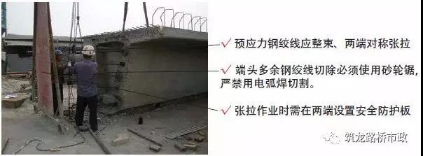 3) 預(yù)應(yīng)力筋張拉時(shí),正面不能站人,并設(shè)置擋板和警示標(biāo)牌。